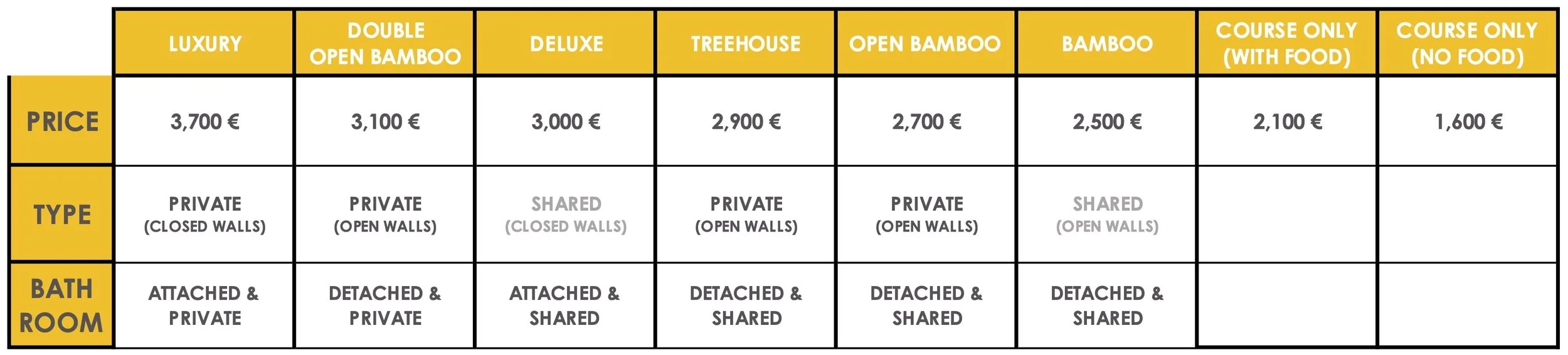 We also offer the 200h YTT as a COURSE ONLY package with food Rp 39,000k (€2100) or without food Rp 31,000k (€1600) or you can also come only for the 5 Days Yoga & Meditation Discovery Course or the 100h Yoga & Meditation Training.